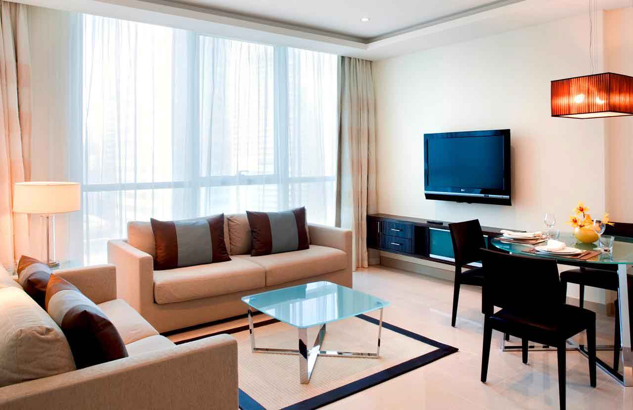 آپارتمان هایی با یک اتاق خواب ( One-Bedroom Apartment) : این سوئیت ها دارای یک تخت بزرگ دو نفره و یک دست مبل راحتی هستند. از جمله امکانات این سوئیت ها می توان به اینترنت وای فای رایگان، سیستم تهویه هوا، تلویزیون صفحه تخت، صندوق امانات، تلفن، میز مطالعه، کمد لباس، وسایل آشپزخانه، امکانات اتو، سرویس بهداشتی اختصاصی، وان، دوش، سشوار، لوازم آرایشی بهداشتی و… اشاره کرد.